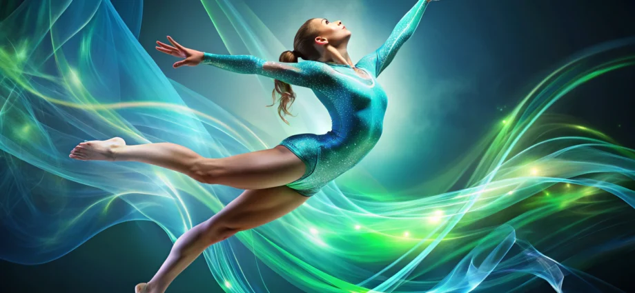 Abstrakcyjna scena przedstawiająca bezpieczeństwo w gimnastyce, z miękkimi, falującymi kształtami w odcieniach błękitu i zieleni, sugerującymi ochronę i płynność ruchu